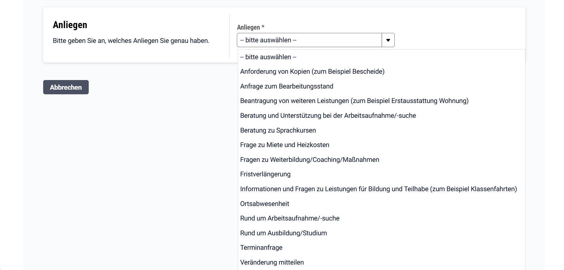 3. Wählen Sie Ihr Anliegen aus und hängen ggf. weitere Unterlagen an.