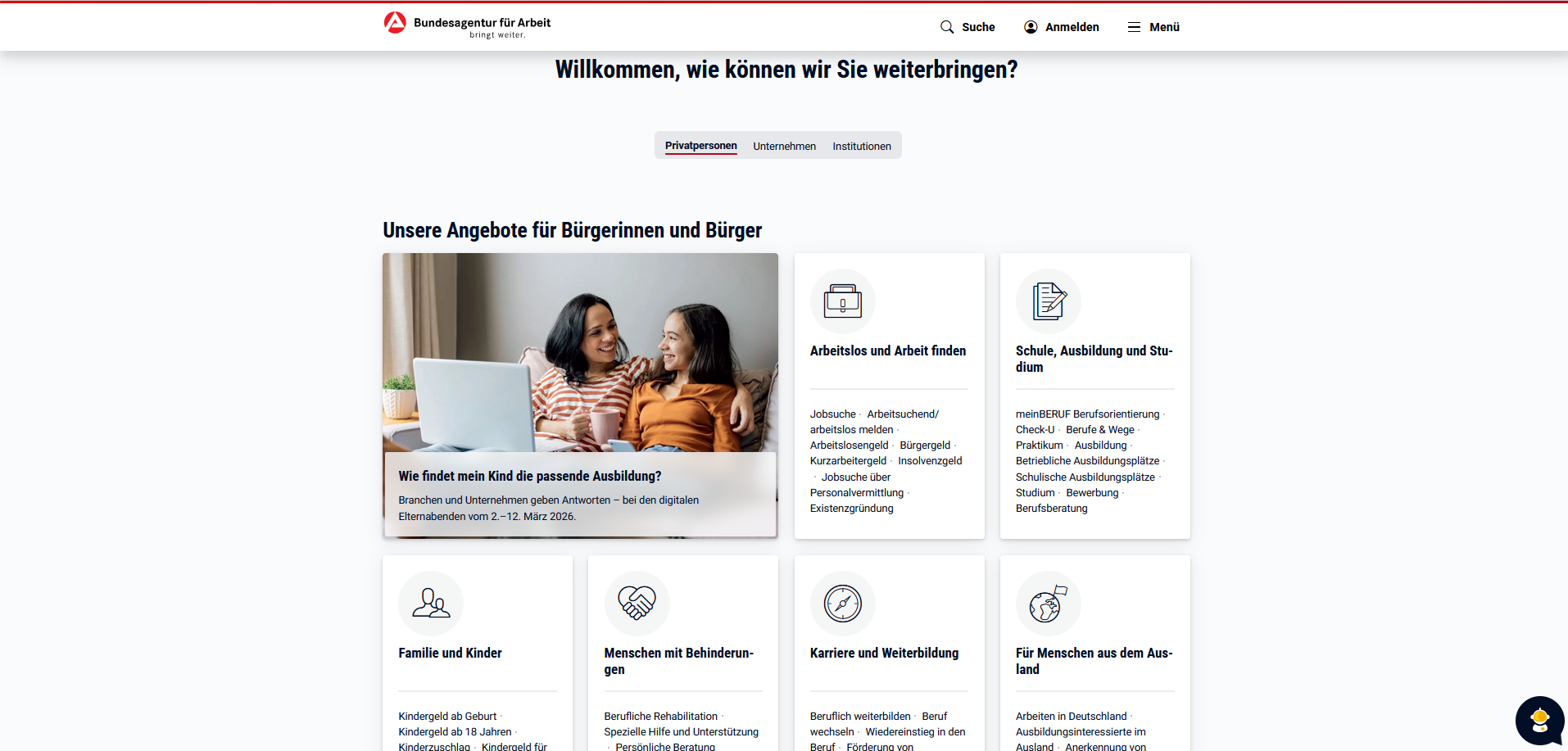 1. Rufen Sie die Webseite der Bundesagentur für Arbeit auf www.arbeitsagentur.de und klicken Sie auf “Anmelden” oder scannen Sie den QR-Code.