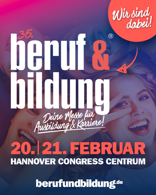 Am 20. und 21. Februar 2026 (Freitag und Samstag) sind wir auf der Fachmesse für Ausbildung und Studium beruf & bildung im Hannover Congress Centrum (HCC) mit dabei. Von 9 bis 15 Uhr (Freitag) und 10 bis 16 Uhr (Samstag) beraten wir Sie gerne persönlich zu unserem dualen Studium!